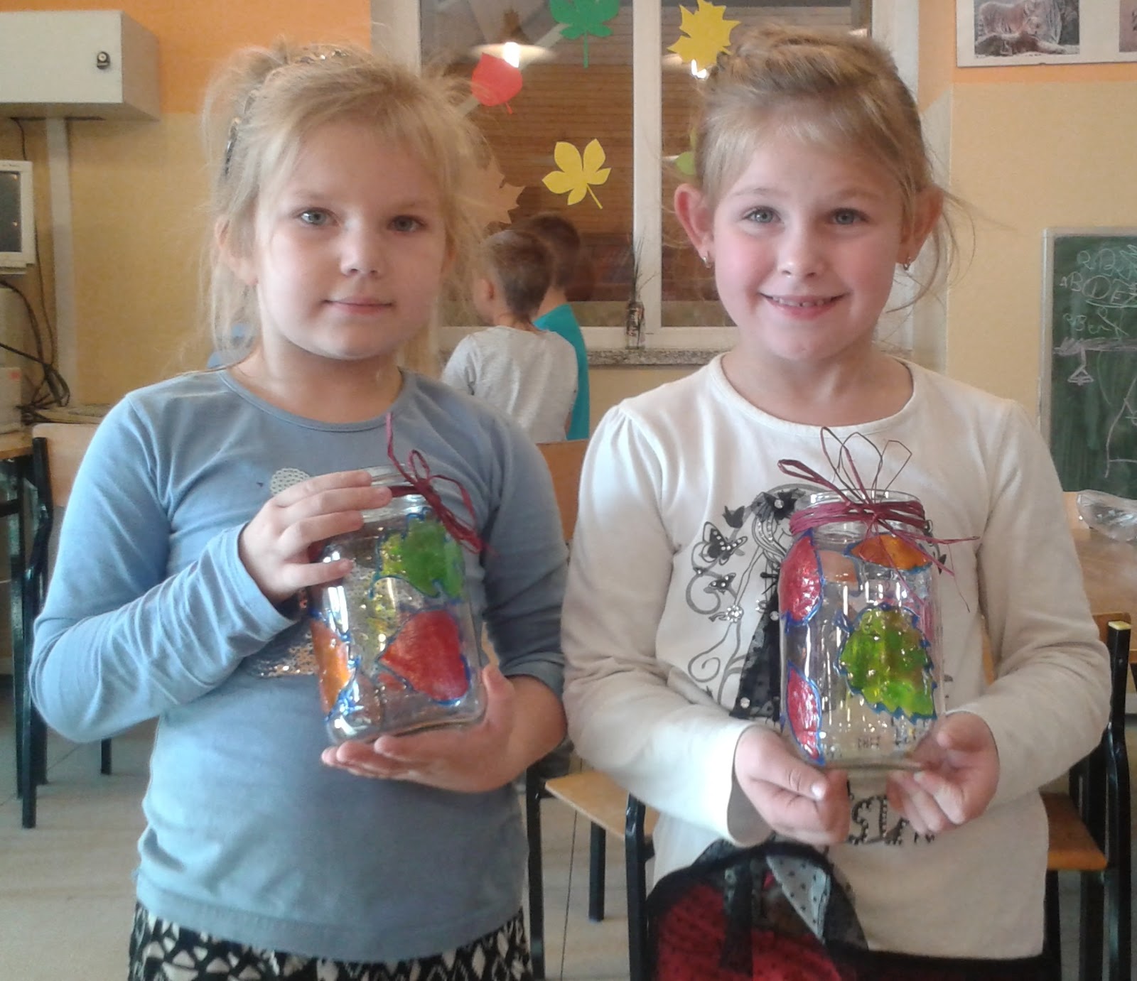 Farby witrażowe można wykorzystać na wiele sposobów. My postanowiliśmy namalować nimi kolorowe liście i ozdobić słoiki Powstały śliczne wazoniki na jesienne bukiety.